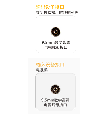 | 電視線接法 將電視射頻線9.5mm端子插入數(shù)字機(jī)頂盒或射頻插座輸出設(shè)備對應(yīng)接口,另一端9.5mm端子插入電視機(jī)輸入接口即可。 |