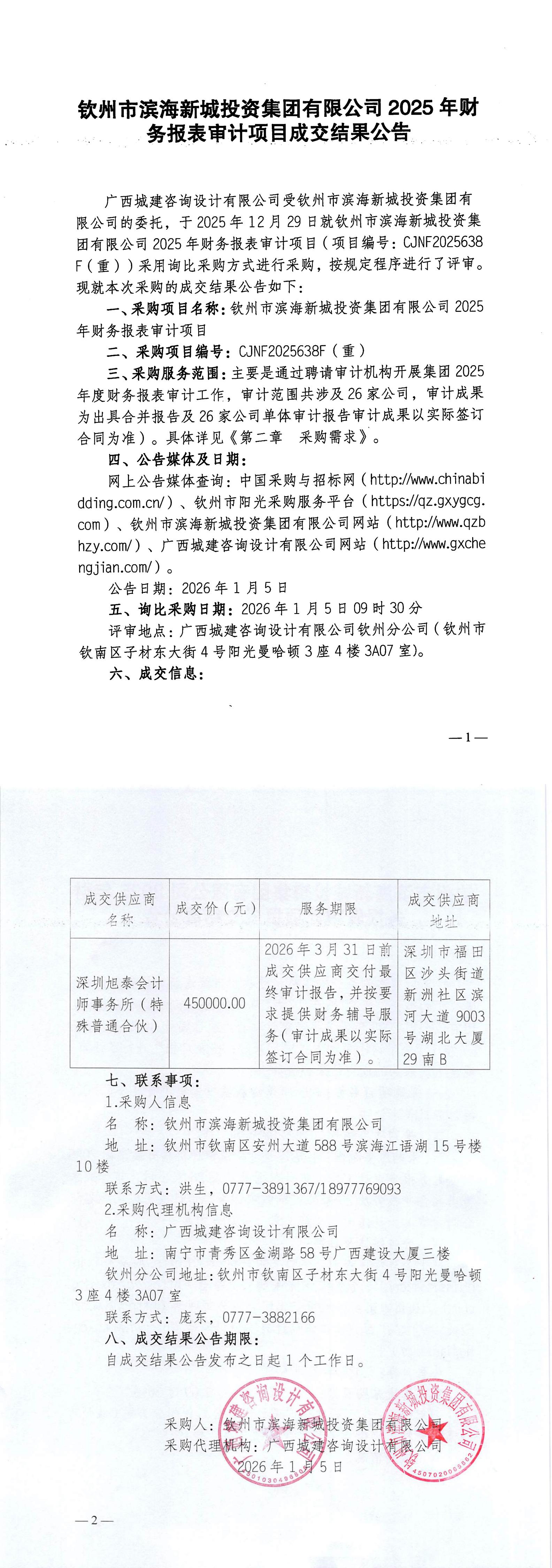 欽州市濱海新城投資集團(tuán)有限公司2025年財(cái)務(wù)報表審計(jì)項(xiàng)目成交結(jié)果公告